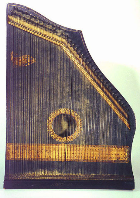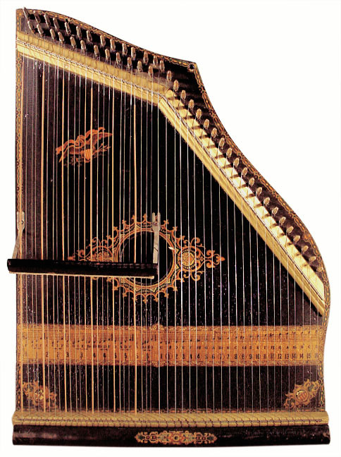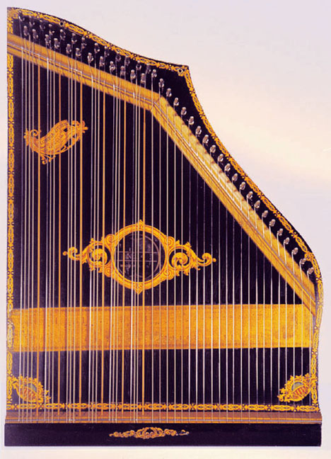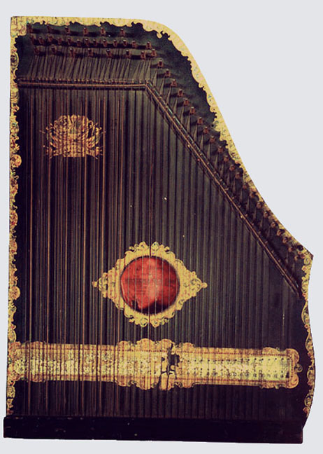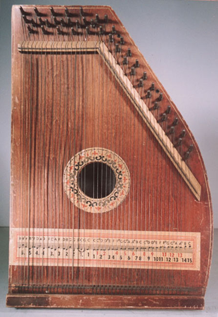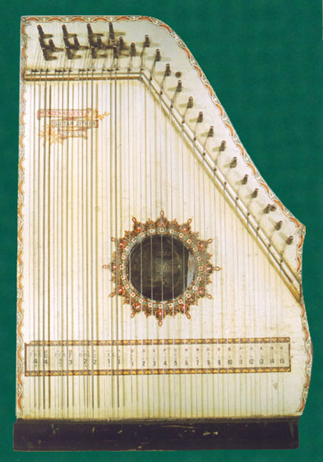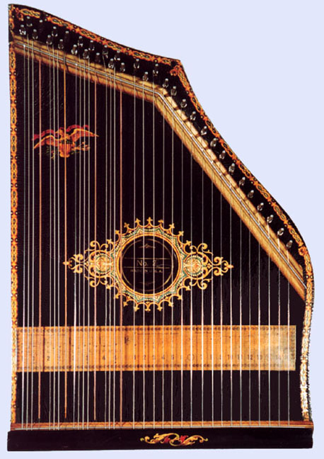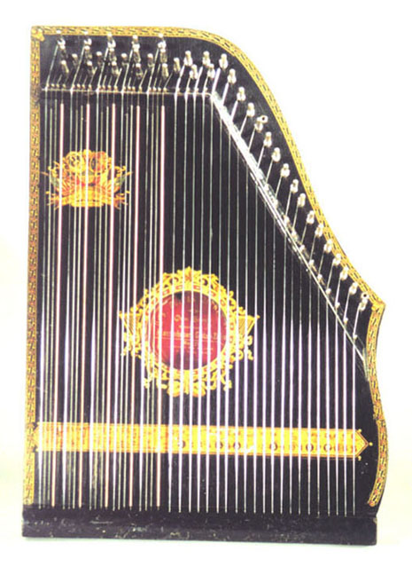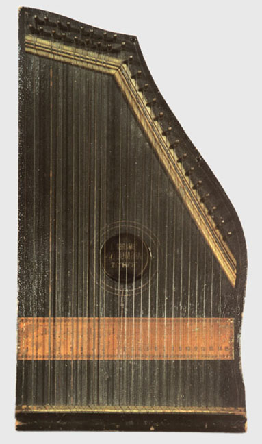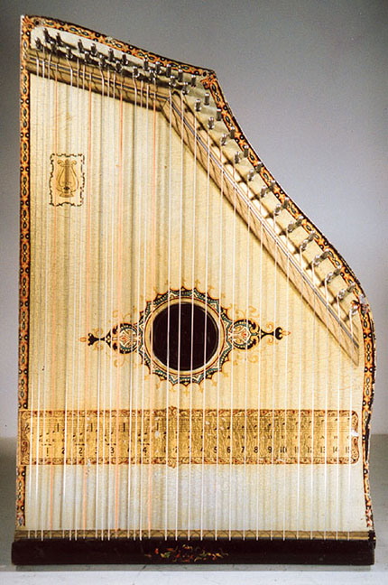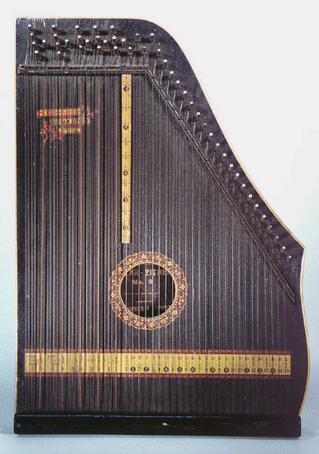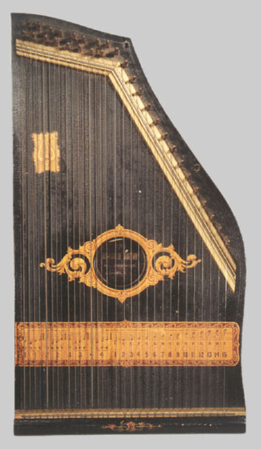 9-chord zitherA 9-chord zither model, the largest of chord-zithers, was also made by Menzenhauer. This model and the 7-chord No. 4 are equipped with two sound holes. |
