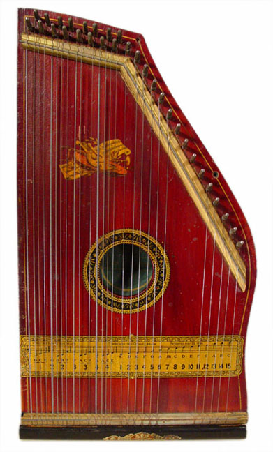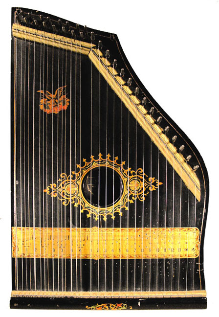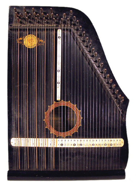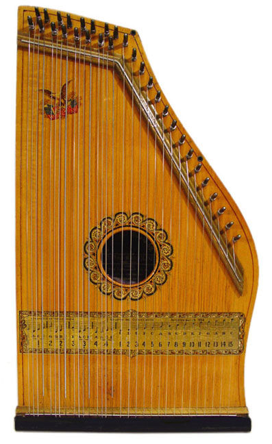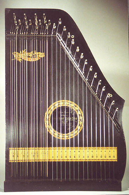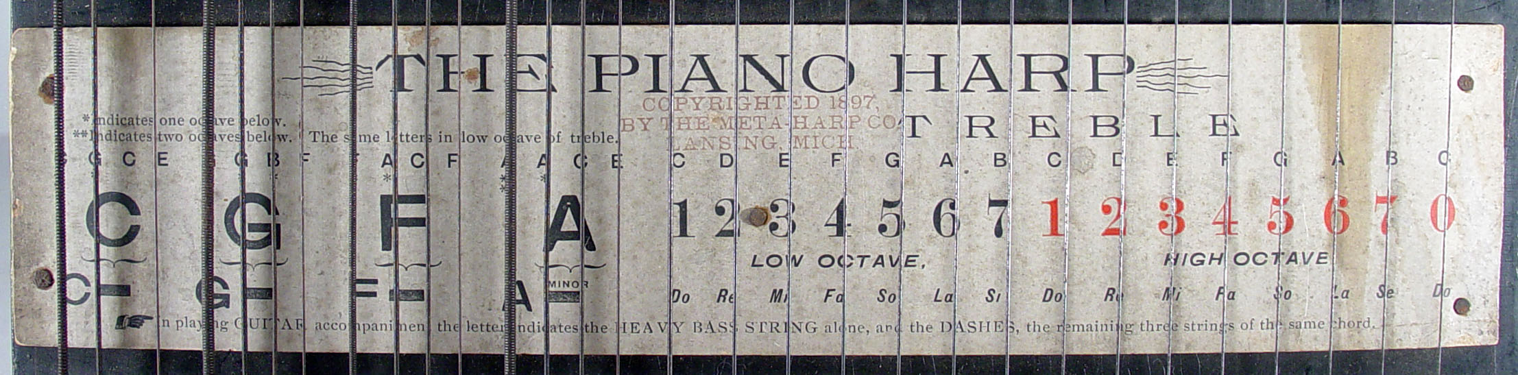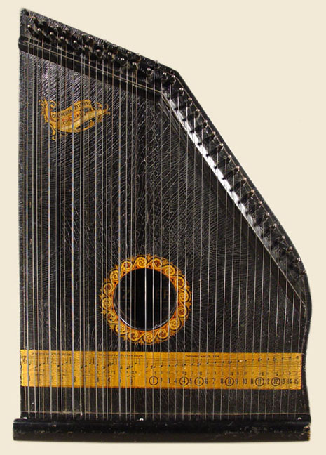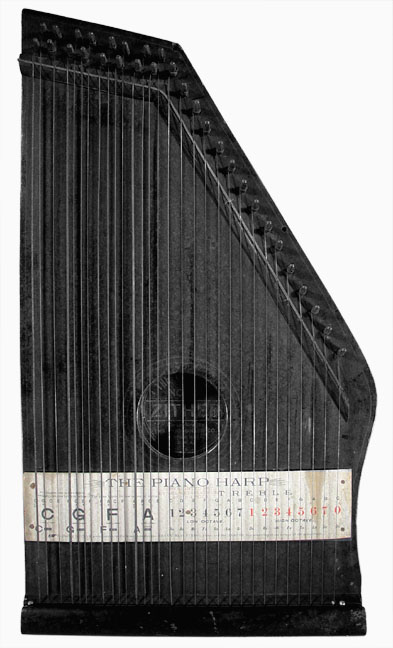 Phonoharp No. 3The Phonoharp Company produced a chord-zither with 5 chords and 17 melody strings. This is the model No. 3. The one accidental of the melody strings, a Bb in each of the two octaves, facilitates playing in the keys of C and F. It is thus supported by the chords. Phonoharp No. 3 chord-zithers