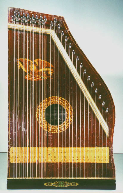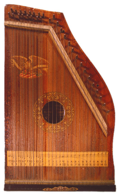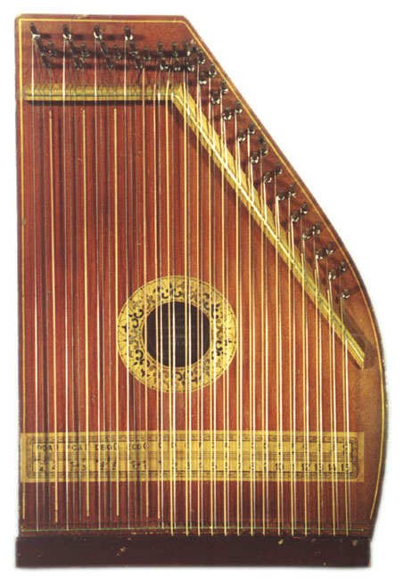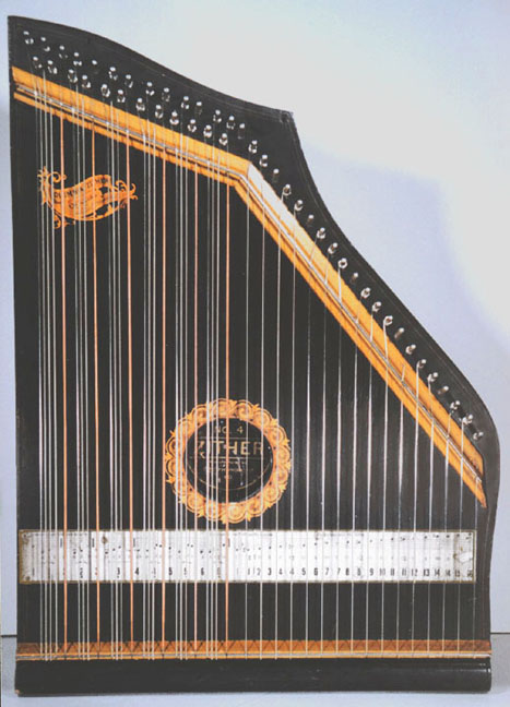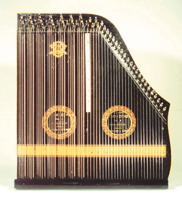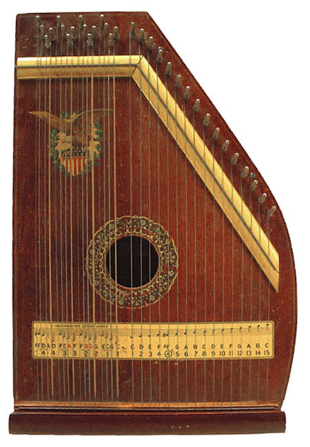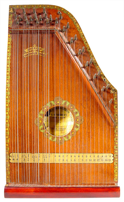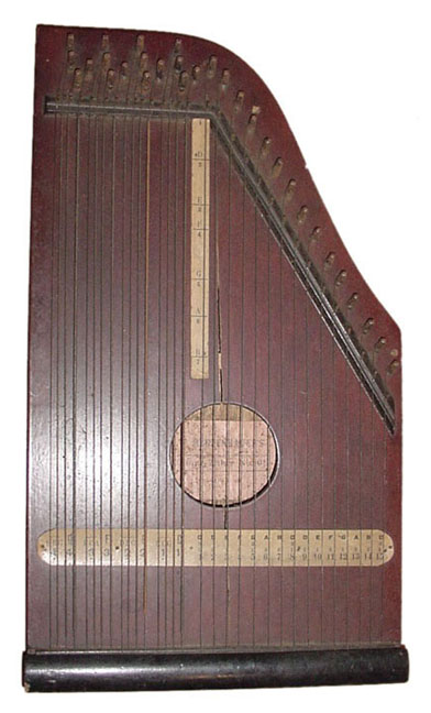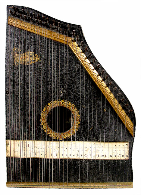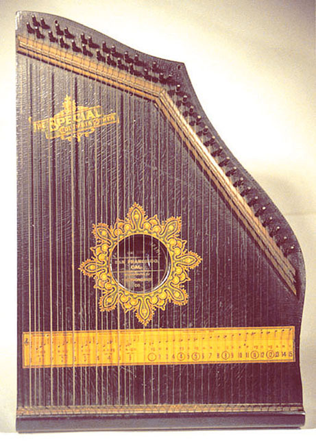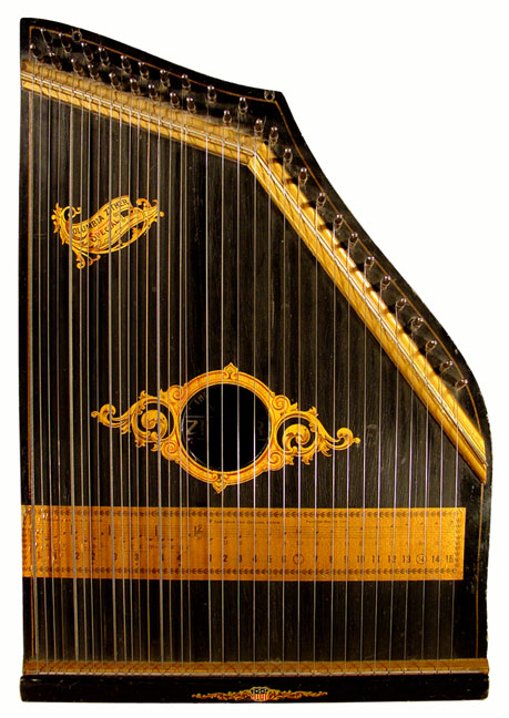 Phonoharp No. 3The Phonoharp Company produced a chord-zither with 5 chords and 17 melody strings. This is the model No. 3. The one accidental of the melody strings, a Bb in each of the two octaves, facilitates playing in the keys of C and F. It is thus supported by the chords. Phonoharp No. 3 chord-zithers