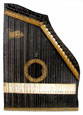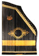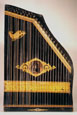 2. Phonoharp in full bloom. This 6/22 chord-zither illustrates the early 20th century ornamentation trend toward the visually striking combination of gold-decals on a black base color. "Columbia Special" soundboard decal, "Handlebar" soundhole decal, "Links" edge border decal, and "Patriotic" lower corner decals. This and the following two examples are probably from the period 1910-20. 3. Similar to the previous example but with a Phonoharp "Eagle" soundboard decal and "Spike" soundhole decal. This one retains the original damper bar, a flimsy attachment that usually has been lost or perhaps removed. 4. Again similar, but with the Phonoharp "Standard" soundhole decal. And again, the damper bar is intact. |