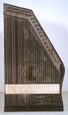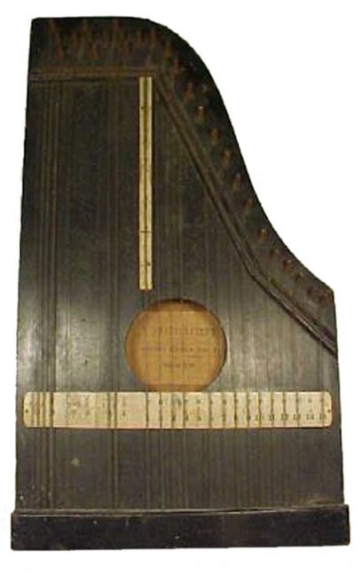 2. black finish; this and the following instrument are later models, probably from the 1910-20 decade 3. silver finish; this finish was used by the Phonoharp and Marx companies as well 4. Like one example of the Menzenhauer No. 0 1/2 chord-zither above (see notes there), this appears to be a Schmidt "re-issue" and represents a later form of the Menzenhauer chord-zither. The instrument shown is possibly from as late as c. 1950. Bridge pins have been dispensed with and the melody string tuning pins are arranged in pairs. Also, the inside label, though it doesn't openly identify Schmidt as maker, is printed on bright yellow paper. A singularly well-preserved example, this image represents its untouched, as-found condition. |