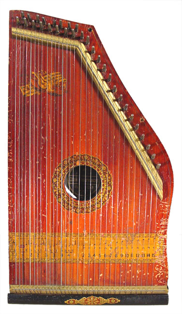 sound clips of this instrument 2. bears no brand or manufacturer name; its only clue as to its identity is the paper label inside, which reads simply "No. 2 1/4, Made in U.S.A.". This instrument has only 15 melody string tuning pins but 30 melody string hitch pins, and other examples like this are known. This illustrates the arbitrary nature with which single vs paired melody string configurations were assigned to this model; the decision that this instrument was to be single-strung was apparently made in mid-production. (see 4/30 version of identical instrument, below) 3. another combination of finish and decals often used for Phonoharp Company chord-zithers. The label is the generic one, same as the previous example. |