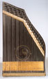 2. Another favorite configuration for the company, the 4/30 model. This instrument was often equipped with the chord thumper gizmo and sold as a "Chartola" or "Chartola Grand." This particular instrument bears a "mandolin-guitarophone" inside label, despite the fact that it does not have the gizmo normally associated with that name...nor any other gizmo, for that matter. 3. This is a large Schmidt scroll-and-pillar-style chord-zither in the 6/25 configuration, a rare instrument. Again, it bears the "Radio Harp" inside label. The "Music Book" soundboard decal suggests this to be a late example, probably from the early 1940s. 3. Another Schmidt 6/25 scroll-and-pillar-style chord-zither, this one with an edge border decal. The soundhole and soundboard decals are purely Menzenhauer, suggesting this example to be earlier than the previous one. |
