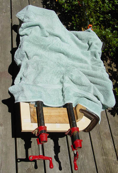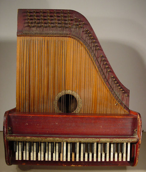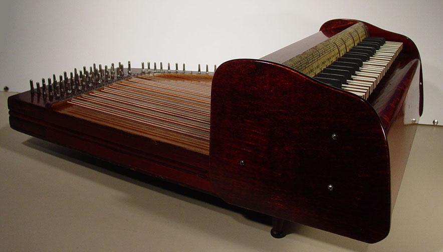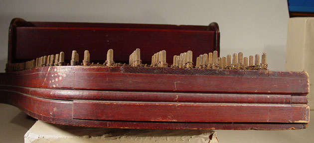 These images below mostly just show the dolceola's "before" condition; only a couple of "action shots" from the restoration are given, those showing one stage of squeezing the joints back together. (Though not evident in the images, the back of the instrument had been removed when these shots were taken.)