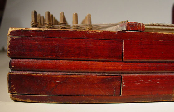 As Dolceolas go, this one was in very good condition. But even the best specimens of these normally suffer from some pretty major sturctural problems, for a combination of two reasons: the original strings are gauged too heavily, and the long finger joints of the frame are weak. As always seems to be the case, this one required disassembly and re-setting of the joints.