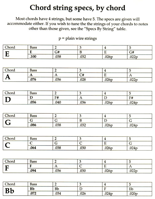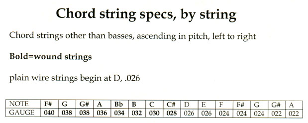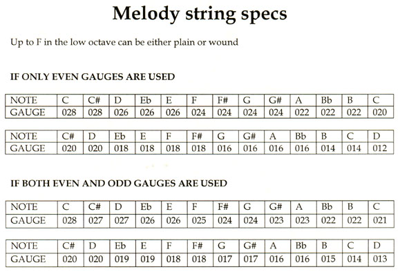 guides to fretless zither string gaugesThe gauges presented in these tables apply to all fretless zithers with the melody strings in the key of C, which includes most of them. One exception is the violin-uke, which is in G. Because these are both very common and very playable, I have included the melody string information for them. Their accompaniment strings are just as long as those of C instruments, so the gauges from the tables are correct for those. The melody strings of the violin-uke are double-strung, i.e., one continuous wire serves as two melody strings (two alternate melody strings, that is...strings #1 and #3 are one wire, #2 and #4 are one wire, and so on. They only use 4 gauges of wire for all the melody strings. Here are the gauges: violin-uke melody string gauges strings 1/3 and 2/4: .022" strings 5/7 and 6/8: .020" strings 9/11 and 10/12: .018" strings 13/15 and 14/16: .016" The gauges in the tables also apply to the long strings of regent zithers, but the short strings are gauge-specific. Again, I will post these gauges as soon as possible.