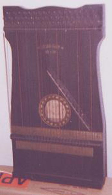The big brother of the harp-guitar-zither, the "American-Italian harp" is another left-handed zither. It has 6 chords and a fully chromatic 25-string melody section. The accompaniment strings of both this instrument and the harp-guitar-zither travel their length through the inside the body cavity and are visible through the sound hole. Both are products of the Phonoharp Company.