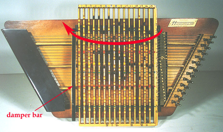 The Harmolin, how it works...The harmolin, like the autoharp, plays chords by means of allowing one to play only selected strings at will, namely those which are tuned to the notes of the desired chord. The means by which it accomplishes this is altogether different from that employed by the autoharp. In my opinion, both are altogether ingenious and successful contraptions. I should point out that some of my photos came out less than great, so I had to do some "doctoring" on them. It is very obvious and not at all artfully done, but it provides simulated visibility that better answers to this page's goal than would have the unaltered images. That said, let's have a look at the harmolin. metal grate attachmentIn the first photo, the metal grate is in playing position, resting on top of the instrument. The instrument itself is to be on a table, lap, or other horizontal surface. This metal grate is removable, and also adjustable, as you will see. The 15 slots in the grate each represent a chord. Also shown is the damper bar, which silences all the strings when pushed down. This is so you can silence a chord as you're changing to a different chord, so the two don't overlap and run together. The red arrow indicates the direction we're going to flip the grate for the second photo, in which the grate will be upside-down. ![]() pin and notches in bottom of grate