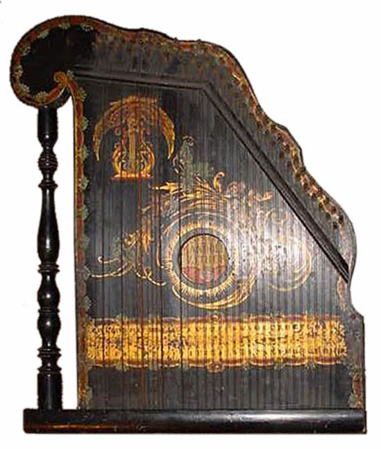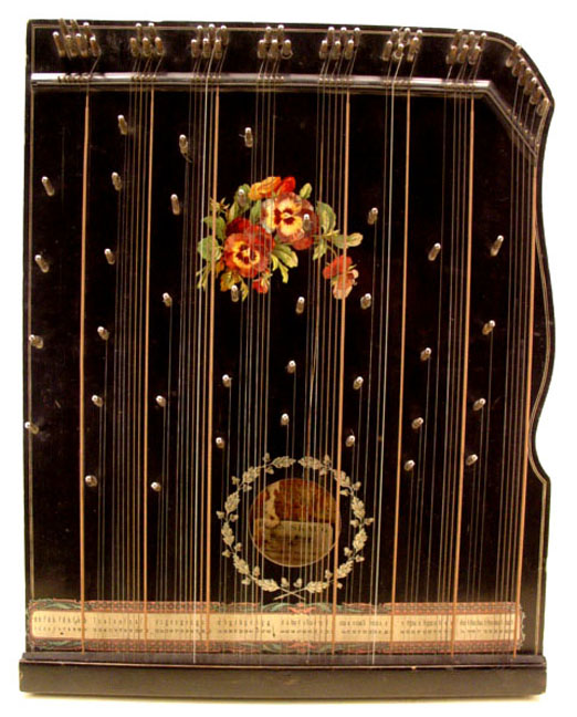 Though this site deals only with fretless zithers of American manufacture, these instruments were also manufactured in Europe, and for the sake of comparison European fretless zithers are touched upon very briefly at the bottom of this page. Germany in particular produced her own nearly endless variety of them, and in fact they are still in production there. The ornamentation and body designs are often different from their American-made counterparts, but for the most part, their functionality is the same. This presents some confusion, as Germany is also the birthplace of some similar-looking instruments that are altogether different from the fretless zither in terms of functionality. So perhaps the best place to begin answering the question above is to take a quick look at a few of these instruments that are not fretless zithers. (Click on images to open larger ones.)