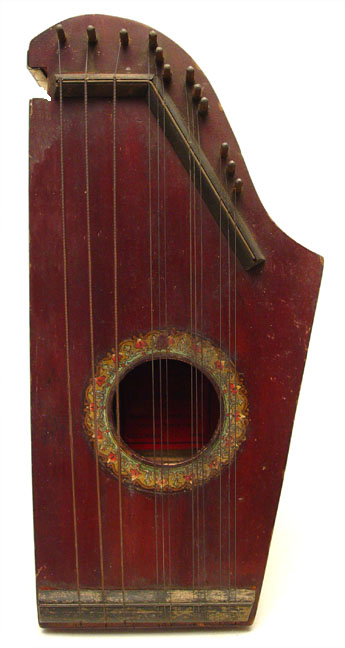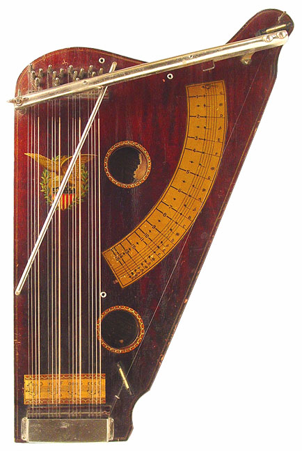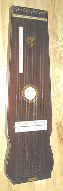 The harp-o-chord was produced by the Harp-O-Chord Company of Columbus, Ohio. This early 20th century firm manufactured a small line of fretless zithers, all of which are unusual. Among them are the company's namesake, the harp-o-chord itself, the "Harp of David," and the "Little Joe." The harp-o-chord is unique in that its melody section is furnished by a separate instrument, namely a harmonica, which fits in the slot at the upper left of the instrument's body. Kelly Williams covers this branch of the fretless zither family extensively at his website, the Guitar-Zither Clearinghouse. To view Kelly's great coverage of the company, click here.