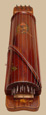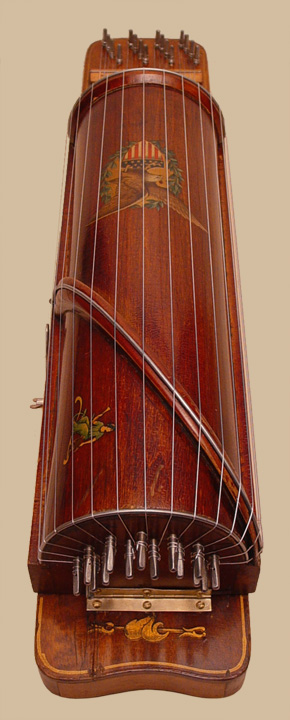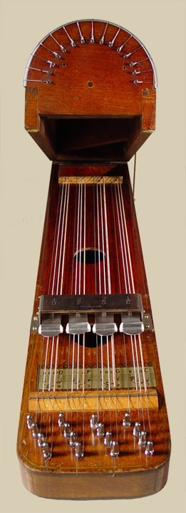 The part of the instrument that accommodates the accompaniment section resembles a rectangular ukelin and serves as a base. The semi-cylindrical melody section is hinged to the base at one end. To ready the instrument for playing, the wing nut on the side is loosened, the entire melody section is raised, and the nut tightened, locking it in the raised position. The reason for this feature is to allow for bow clearance when playing the strings nearest the bottom.