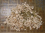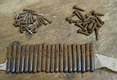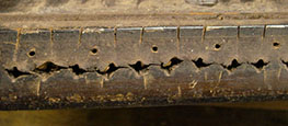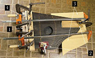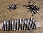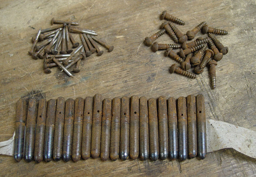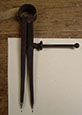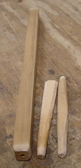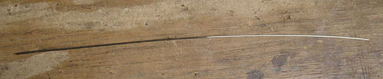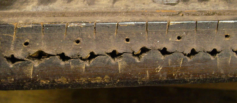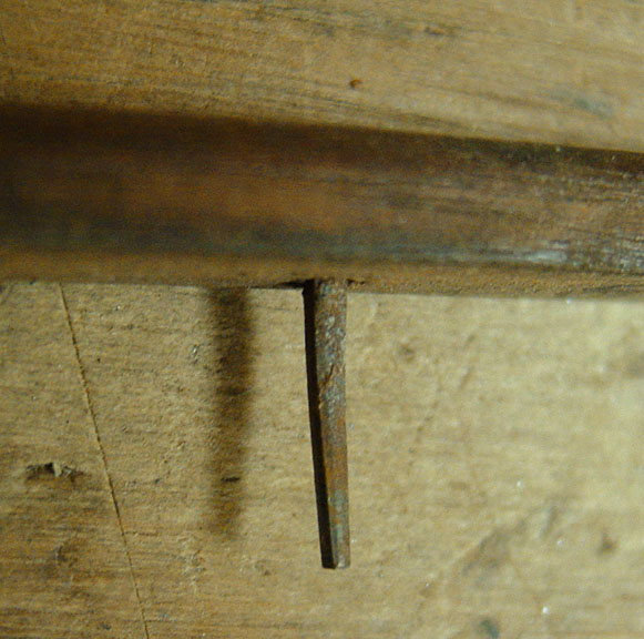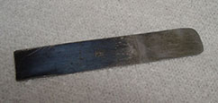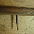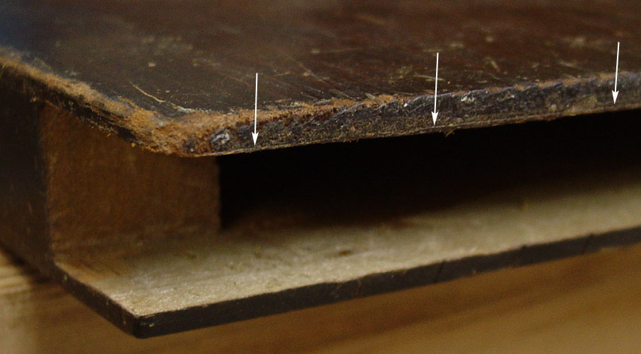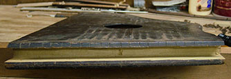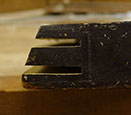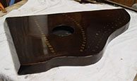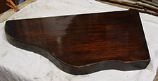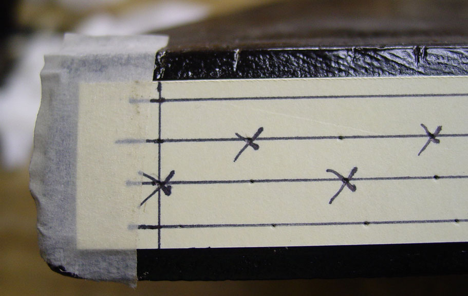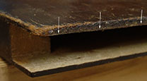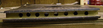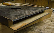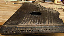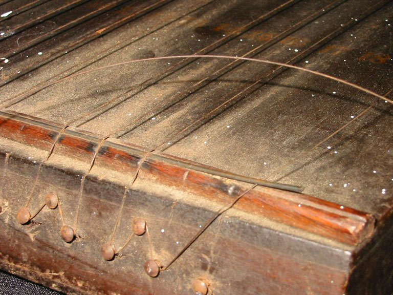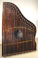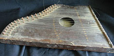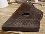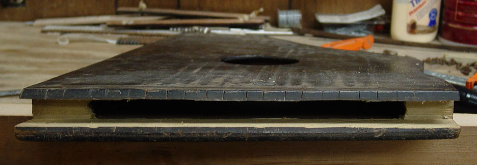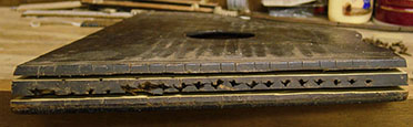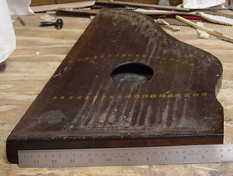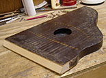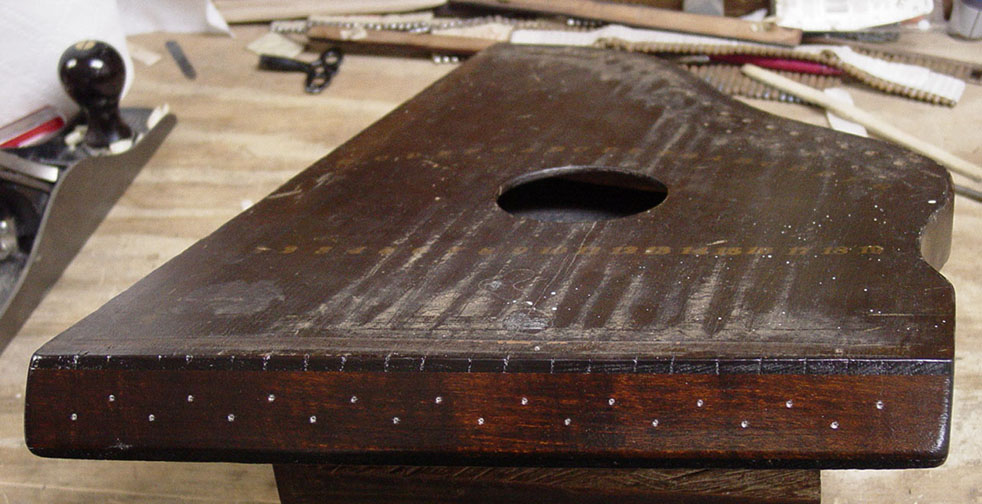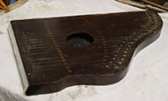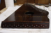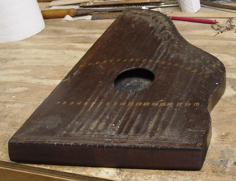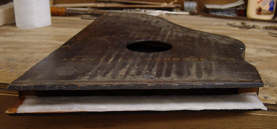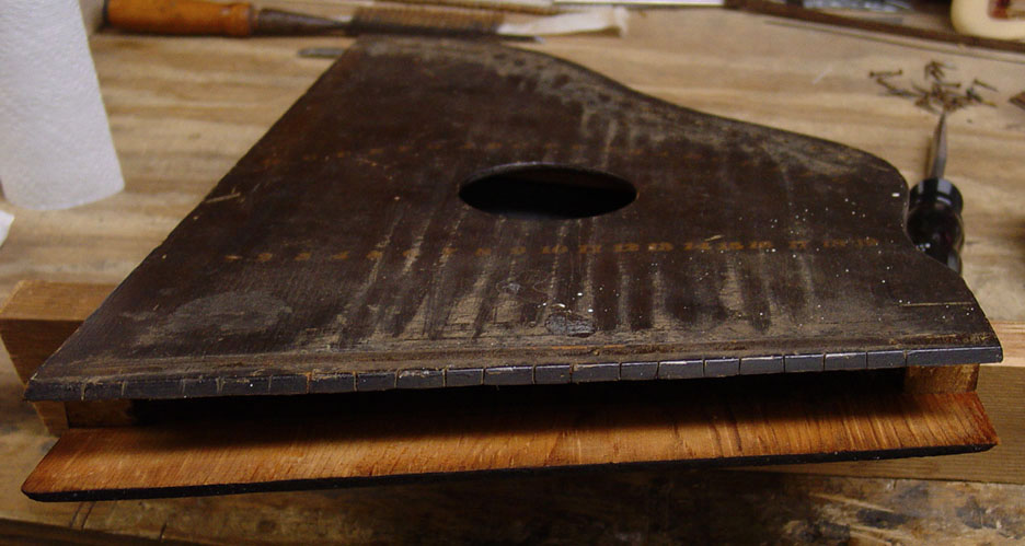 All-Melody Fretless Zither Restoration![]() The instrument at hand is a simple all-melody fretless zither of a type believed to be from the 1860s or 1870s. These early fretless zithers are characterized by their having the tuning information and string numbers imprinted in an arc across the soundboard. These zithers also quite often have the tuning pins set into the edge of the frame, a structural and functional error. Fortunately the subject of our restoration project has the tuning pins set into the block through the instrument's front as came to be the usual. There is no head bridge. Instead, screws serve as individual bridges for each string. It is interesting to note that an idea similar (though not identical) to this was adopted by Oscar Schmidt Company and incorporated into the design of certain autoharp models over 100 years later. Here is a look at the instrument as we began its restoration. As this type goes, this one's condition was quite good. ![]() However, it had one significant problem, namely that the tail block was severely cracked. This was in part the result of the unwise practice of using one piece of wire to make two melody strings, which puts undue stress on the hitch pins. This can crack even hard maple hitch blocks. ![]() Here's a look at the damage. ![]() But also, the block didn't look to be made of hard maple as it should be. It could be that it was rotten, but it didn't look like it had been wet. Besides, if it had been wet enough to have rotted, the joints would be wide open. As can be seen, they were as tight as the day this instrument was made. So, I was faced with a treatment decision. After considerable thought, I decided that the tail block must be replaced with a new maple one. After more thought, I proceeded with my plan for removing the old block. ![]() The first move was to make two passes through with the table saw, staying well clear of the joints. Sure enough, this revealed the tail block to be made of old growth poplar, which is quite soft. The decision to replace it was looking to have been a good one. ![]() The outer surface of the block was angled, which I suspect to be a less than great idea. But squaring it off would be too big a design alteration. Remember, I'm not proposing to change it, but only to make it well again. ![]() The next step was to chop out the middle with a hammer and chisel. Nothing fancy, just chop. ![]() Then I drilled through to the inside with a 1/2" spade bit. Again, nothing fancy, just drill. ![]() More chopping followed. ![]() The chopping grew steadily less aggressive and more focused on precision. At length, the hammer was set aside and the chisel was used as a carving tool. I carefully worked down through the old block until essentially a veneer of it was all that remained. Bits of it disengaged cleanly, as can (sort of) be seen in the photo, but the rest was hanging on for dear life. ![]() Here is a close-up look, showing the thickness of the remaining wood of the block. The arrows indicate the joint. ![]() Next I boiled some water and painted it onto the wood of the old block, then soaked a paper towel and sat it on the wood to soften the glue. I left it there for about 5 minutes. ![]() After two such applications, the glue had softened to the point that the remains of the old block were ready to come out. I used this tool to slide in under it. It's a battle-worn piece of .010" spring. I mainly use it for administering glue in places where no other tool can go, but it worked quite well for the purpose at hand. ![]() Here is a shot taken right after the block was out. I stopped at this point and let it dry overnight. ![]() And here is a piece of the block after removal. The side shown is the glue joint side. As can be seen, the parting was a clean one; there are virtually no splinters from the surface it was joined to. Incidentally, the diagonal cut is from a point in its removal when it was to my advantage to cut it, which I did with scissors. ![]() The following evening, the new block was made up, carefully fitted, and installed. I have provided a numbered image with text at the linked page, as it's a little confusing to tell what's going on here. 1. I always clamp to a "clamp board", a board that spans the whole surface (or near to it) of the back . Its purpose is to provide an overall flatness reference, to prevent the block from shifting upward or downward, as can happen if it is glued "in mid-air." It is a piece of 3/4" cabinet-type plywood (smooth face, no "footballs", and flatter than construction grade .) It is covered with wax paper so I don't glue the zither to it. As I was gluing only at the tail end, I didn't need a clamp board that fit the zither's outline exactly, and since I'll probably never restore another one of these, I preferred not to make a new one for it if I could help it. The one I used was for a No. 73 autoharp, and it worked fine. I had to situate the zither a couple of inches away from the tail end of the clamp board for it to be wide enough, and the exposed couple of inches of it can be seen in the photo. 2. As mentioned, the entire instrument is clamped to the clamp board, and that's what these two clamps are for. 3. In addition to merely clamping the top and back to the new tail block as the 4 clamps at the tail end in the image are doing, the block must also be clamped inward. For this I use a thing I call a "clamp dog." Its purpose is to provide an edge parallel to the tail end of the zither to clamp against. This prevents the block from shifting left-to-right, i.e., in the direction of the instrument's width, which it will do if clamped against an edge not parallel to it. Clamp dogs are also usually made from 3/4" plywood, though 1/2" will normally do in a pinch. 4. Here the excess wood of the new block itself can be seen protruding from the zither's tail end. ![]() Next evening, the zither was removed from the clamps and the new block was planed flush overall. I had to round of