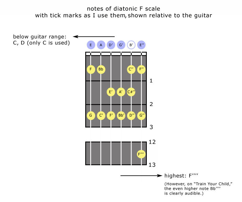 My use of tick marks to indicate octaves is purely relative. I don't know which octaves they indicate when properly assigned; I only know that each additional one indicates ascent of pitch. I begin octaves at C, and again I don't know if this is proper. The best way I could think of to positively identify the range of pitch I use was to illustrate it relative to the guitar, and clicking the thumbnail image to the right will open a "map" image which does so. Note: I use the small "b" for the "flat" symbol, as I don't have that character in my assortment of fonts. It gets the idea across. notes on my use of split-level bridges