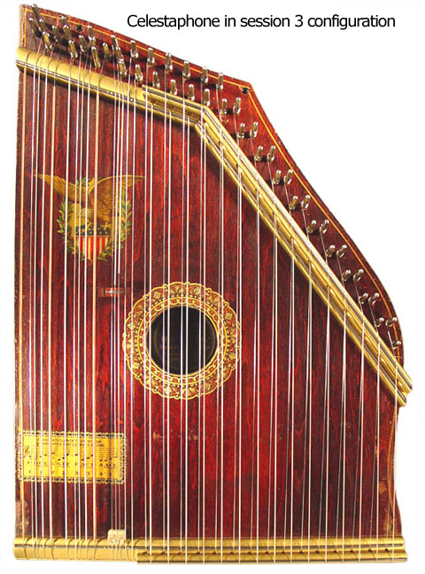 You will notice that this setup required an extra bridge that sits out on the instrument's front. That is because some of the notes in WP's Bb chord are too high for any string stretched the full length of the zither to come anywhere near making it without breaking. (This isn't speculation; this statement is substantiated by experiment. e.g., an .010" string snapped at around F#''', essentially a full octave shy of the mark.) Another comment on the F'''' note in the accompaniment section is that it is audible in some session 1 recordings, though not as prominently as at session 3. I only tried to duplicate it on the session 3 instrument. Incidentally, relative to either of the instruments involved or either of the two sessions in question, there is no significance to my using a Phono 4/30 for the first session setup and a Celestaphone for that of the third. When I began the third session experiment, I had already re-configured a 4/30, and I wanted to compare the physical aspects of the two different instruments in regard to the possibility of their having offered WP motive for creating his double-zither instrument. I refer here to the fact that the melody section of the 4/30 and (especially) the accompaniment section of the Celestaphone are both crowded to the point of making them more difficult to play than the corresponding sections of the other instruments. In my opinion, this comparison added much support to the theory.