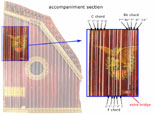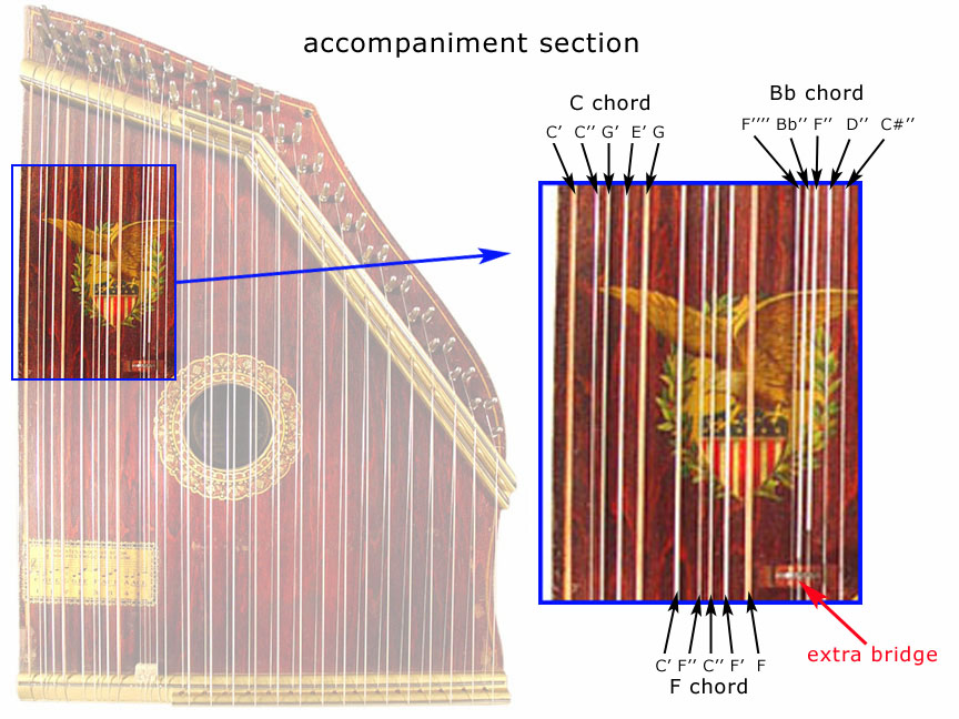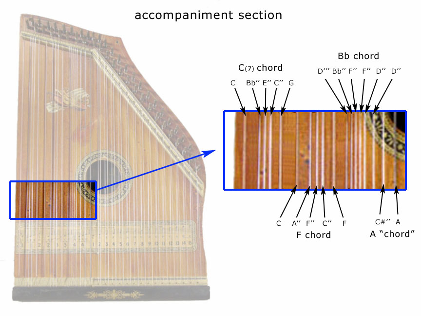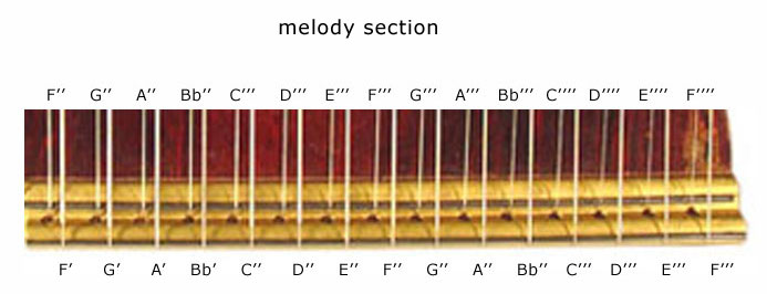As was first theorized by Gregg Miner, octave-tuned melody pairs turned out to be "the key to the kingdom" of the WP instrument's melody section sound. The melody tuning of the Phono 4/30 and Celestaphone (and virtually any chord-zither), as prescribed by the manufacturers, is two diatonic octaves of C. The WP melody section is tuned in two diatonic octaves of F. We were all stumped for a time not only by the higher pitch of WP's melody range but also by its range, which was nearly three octaves. It was a breakthrough realization that octave-tuned pairs increase the diatonic 15-course melody section's range by a full octave, from its usual two octaves to a full three. notes on my use of tick marks