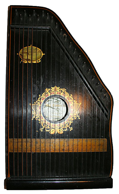new century harpThe "new century" of this instrument's name refers to the 20th, in the early years of which the "new century harp" was patented and first produced. Functionally, the idea is that the player creates chords from individual strings, rather than having designated strings pre-grouped into chords, as in the case of chord-zithers, ukelins, etc. This instrument was probably produced in only one model. The examples shown are functionally identical, differing only in their decalcomania. new century harps, left to right