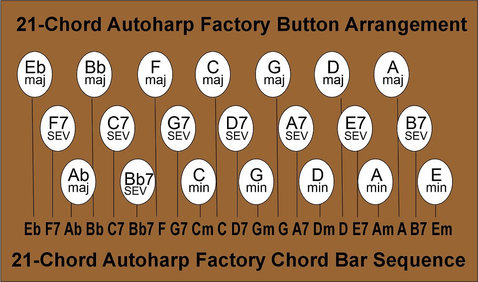 The picture to the right shows the chord buttons in the arrangement that 99% of Oscar Schmidt 21-chorders use.