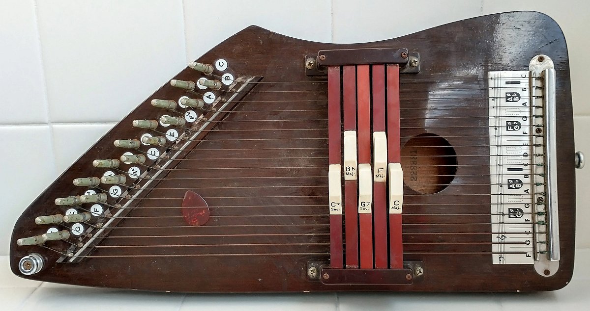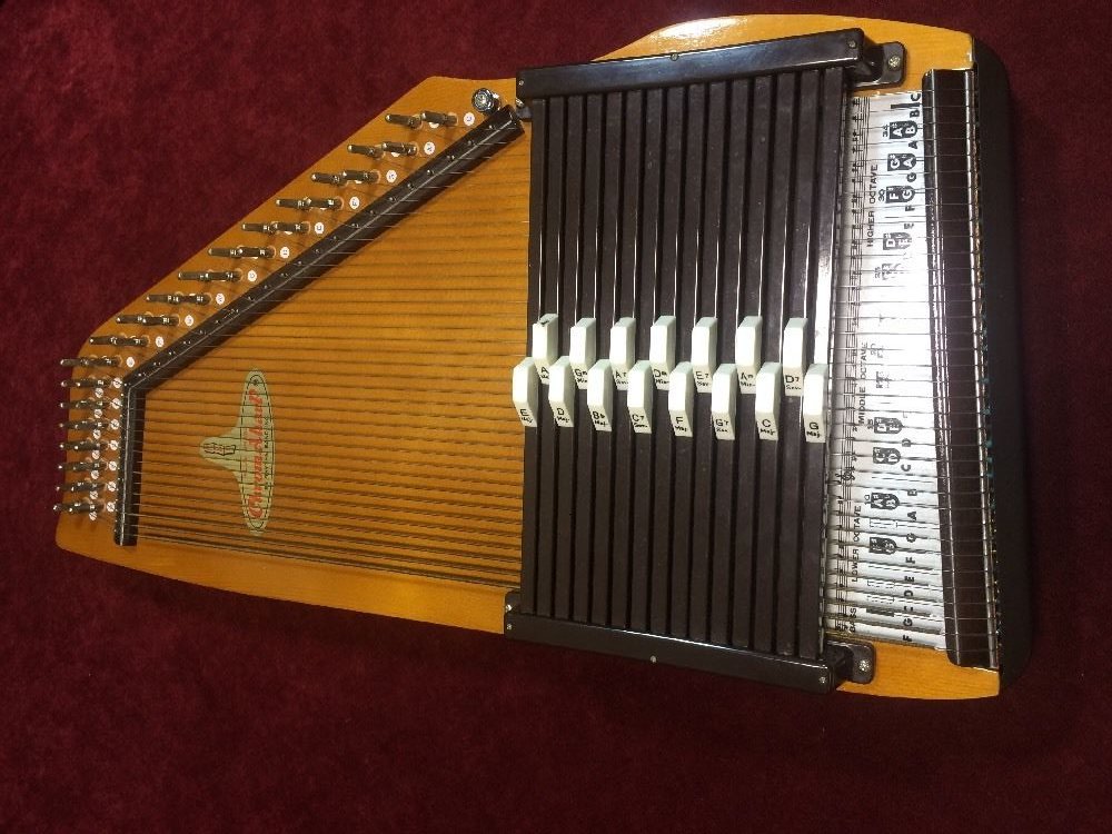 | Autoharp History OverviewThis is a brief overview, based on facts and artifacts I have been able to piece together from multiple sources. Becky Blakely's The Autoharp Book contains a definitive history of the product line we now identify with Oscar Schmidt, so it's a far better resource for information about those instruments, but it's also out of print and hard to find.In my own research, I kept finding autoharps from other manufacturers, so I've included a few brands that Blakely ignored. Oscar Schmidt purists are often offended to imagine that anyone else ever built competitive instruments worth playing, but I've gotten my hands on a few. and I find them delightful. That said, there are many variations even of the most common models, and no one resource - even Blakely's - could cover them all. What I've tried to do is to provide an overview of the general trends that influenced autoharp design and availability since the late 1800s. As a result, there will be what some folks consider major omissions. But if you come across an unusual autoharp, this article may help you figure out where it fits in. Born of a "Zither" Movement - Autoharps were one of many commercial attempts to bring music into essentially non-musical households that started in mid-to-late 1800s. Traveling salesmen hawked similar devices from the East to the West. Mail-order catalogs listed instruments that "anybody could play." The focus was often on different kinds of "zithers," instruments with a row of strings like a small piano soundboard. The "chorded zithers," like the one shown to the right, were designed so you could easily play a chord with one hand, while playing the melody with the other. See our article "Autoharp Precursors and Competitors" for several examples. Stopping the "Wrong Notes" Versus Playing the "Right Notes - In the late 1880s, Karl August Gütter of Markneukirchen, Germany, built a chorded zither that made it easier to avoid playing the wrong strings.