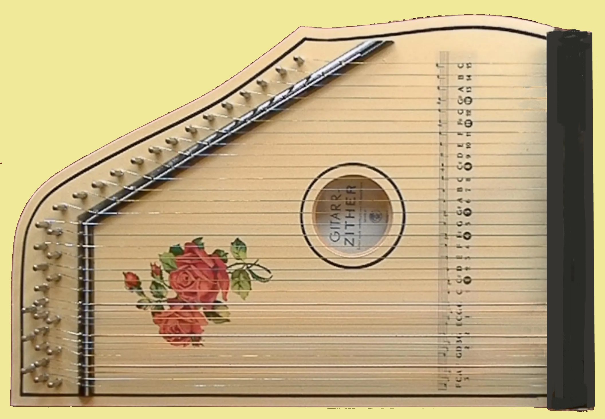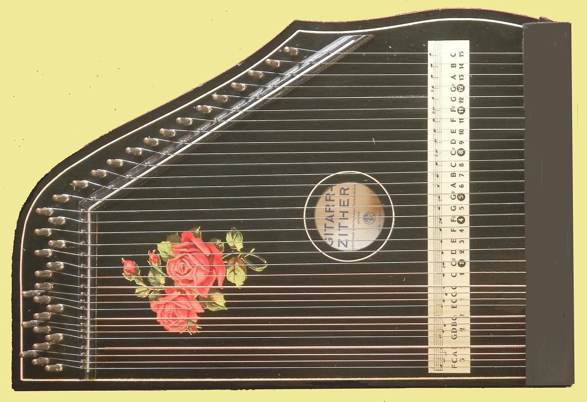 It's not hard to figure out why so many of them show up after fifty years with a week's worth of wear on them. Most of them show up without the song sheets today, which is why we scanned the ones we could track down and provide printable versions for you. "Rosen," "Jubel-Tone," and "Musima" Zithers - Why So Many Brand Names? - Most 3-chord zithers you come across were built or at least designed by the Hopf family, who have made zithers and autoharps in Bavaria since the early 1900s. The Hopf family's zithers were identifiable by a rose decal ("Rosen") until soon after 1972. That's when the East German government demanded that they lose the rose and rename their brand. Most zithers went to a wildflower decal that is still popular today. Brands from that era are typically "Musima," the GDR industry name or "Jubel-Tone," an old name that was revived for instruments that were going to be sold in non-Communist countries. Why Three Chords? Hundreds of thousands of Pop, Country, Folk, Bluegrass, and even Rock songs can be played with just three chords. Frankly, the 5-, 6-, and 7-chord zithers are also made for playing 3-chord songs. They just let you play 3-chord song in other keys. If a song uses more complex chords, you probably can't play it on a 5-chord zither either, so don't feel like having "just" three chords is a major restriction. Besides, you can transpose any 3-chord song to the key of C, which is what these zithers use. You might not be able to sing the song in that key, but that's not the zither's fault. :-) True "Children's Zithers" - One similar class of 3-chord zithers was also made during this era. If you see a red 3-chorder with another decal, say a clown or children singing, it may be a smaller version with fewer strings (say, 15 melody strings instead of 21). The instructions on this page won't be as useful for those. The two-chord version, if you come across one, really is a toy. I assume both those versions came with song sheets as well, but I have never recovered any. Reviving a Guitar ZitherTry to find a zither whose face hasn't warped or split, and whose strings aren't too rusty. Not saying that you can't rebuild or restring a badly damaged zither, but you deserve to start on one you can play without serious restoration.Keep the Strings if You Can - If you come across a zither with most or all of the strings, don't replace the strings at first. They're made like piano strings, and will last decades. Later you may decide to replace them, or you may decide to put that money toward an upgrade. For now, if you just need a few replacements, you can go to a music store whether the guitar tech has a micrometer and buy appropriate guitar strings as a temporary fix. If you have a source for the right gauge of piano wire, that's even better. Unfortunately I can't find a chart telling you what gauge you need for each string of your zither. The best you can usually do is use a good micrometer to measure the strings on either side of the missing string and choose a gauge between them. Cleaning - German-built zithers generally have a thick layer of varnish, so you can use gentle cleaning products on them. If the problem is just dust, a bit of felt glued to a paint stick can do the job in a hurry. More likely, things are a bit gummy. You can use a thin damp rag over a ruler or some such to get under the strings. Try not to get the water or cleaning product on the strings if you can avoid it. If your zither has an open grain or badly damaged finish, a guitar polish might be your best bet. Also, some zithers have unprotected paper, either the note name strips or the gingerbread circle around the sound hole, so be careful not to get those wet. To clean the bits around the bridges and tuners, you'll need Q-tips or a similar product. We have a video about cleaning a related instrument - autoharps - here. Tuning - Most zithers need tuning wrenches that are the same as those used on autoharps. If you have a piano, it might be easier to tune to that first, then use a digital tuner for fine tuning - many digital tuners will have trouble properly identifying strings that are badly out of tune. If you don't have a digital tuner at first, you can probably download a chromatic tuning "app" for your smartphone. For a zither that has not been tuned in some time, you should consider wearing eye protection and expecting to break at least a string or two.. Whatever you do, don't hold it close to your face while tuning. Playing 3-Chord Guitar ZitherThe expectation is that you will play the chords with your left hand and play the melody strings with your right hand.Left Hand -The chords on guitar zithers are arranged with the lowest note of each chord farther away from the player. So for the chord to sound "right," (with the bass note sounding first, you play the chords with a pulling motion, using a fingerpick on the middle finger of your left hand.